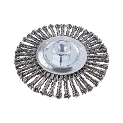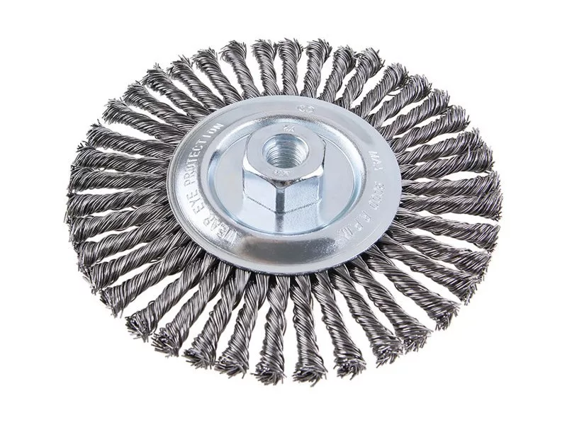 Forgókefe - radiális, kivitel: COPY - szabadalmaztatott huzal 0,5 mm - másolás, extrém terhelés mellett sem bomlik ki, a FESTA kefék garantálják a minőségi felhasznált anyagokat és megmunkálást, átmérő 150 mm Menet M14x2mm Horganyzott kefetest Huzalok száma: 1584, Huzal hossza: 27mm max. megengedett sebesség: 10000 1/min Alkalmazás: festék, rozsda, sorja, hegesztési maradványok, salak eltávolítása, érdesítés, fém tisztítása