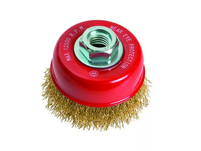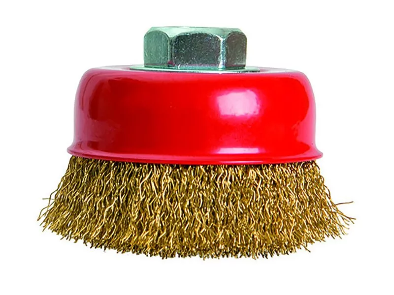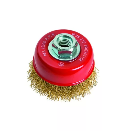 Tálkefe sárgaréz hullámos huzalokkal, M14-es rögzítéssel, csésze alakú, rozsdamentes anyagokhoz alkalmas.