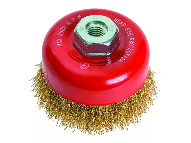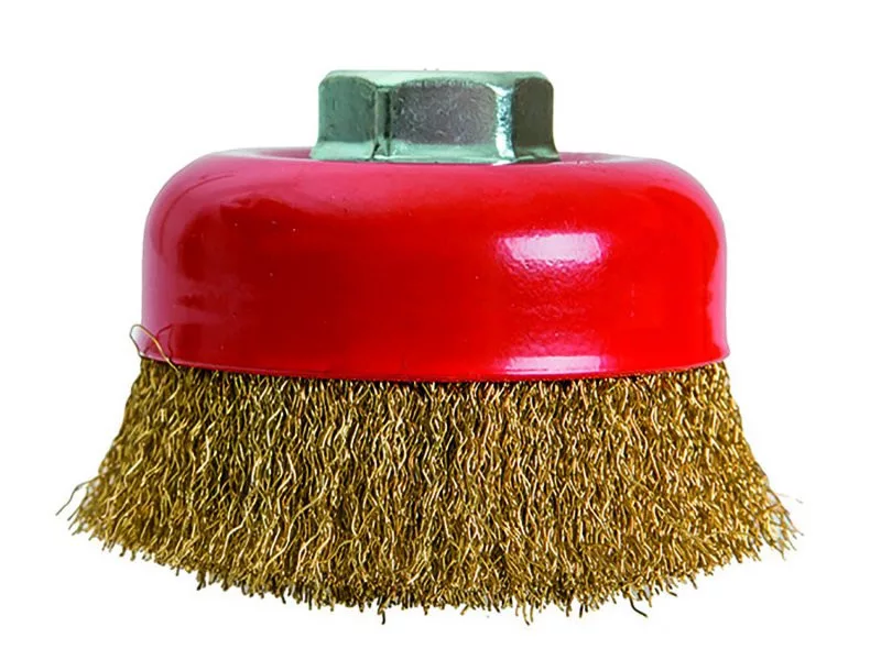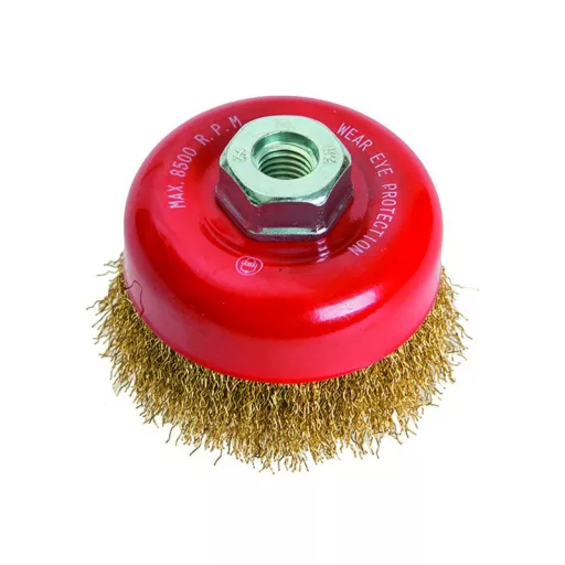 Tálkefe sárgaréz hullámos huzalokkal, M14-es rögzítéssel, csésze alakú, rozsdamentes anyagokhoz alkalmas.