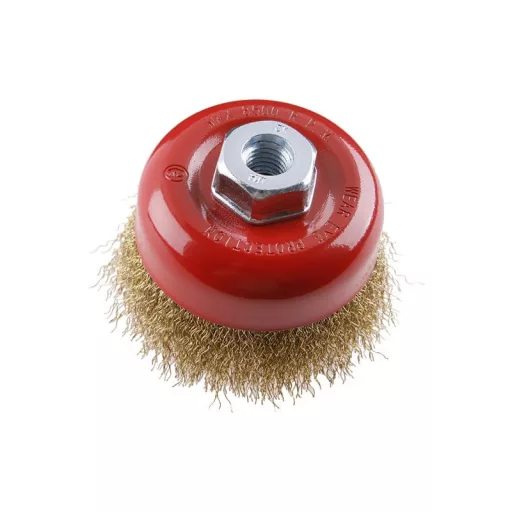 Forgókefe - csésze, FESTA kefék garantálják a minőségi felhasznált anyagokat és feldolgozást, hullámos huzal - sárgaréz bevonatú 0,3 mm, átmérő 100 mm, huzalok száma 2500, huzal hossza 26 mm, maximális fordulatszám percenként. 8500, szerelés M14*2mm, maximális fordulatszám percenként. 12500, rozsda eltávolítására alkalmas, festék, polírozás..., csomagolás: euro lyukkal papírdoboz.