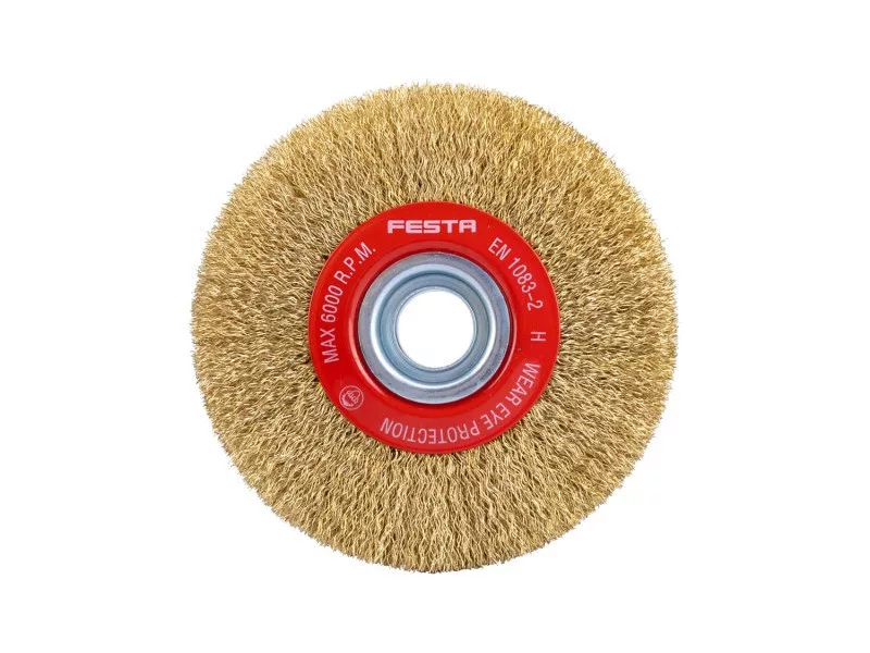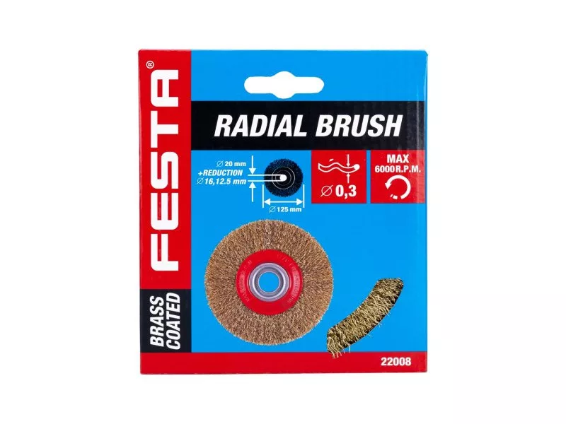 Forgókefe - kör alakú, kivitel: hullámos huzal, huzal 0,3 mm, FESTA kefék garantálják a kiváló minőségű felhasznált anyagokat és megmunkálást, átmérő 125 mm, rögzítési furat 20 mm (12,5 és 16 mm-es szűkítő gyűrűkkel együtt), huzalok száma 4950, huzal hossza 22 mm, maximális fordulat/perc. 6000, lakatos és fémmegmunkálási munkákra alkalmas, rozsda eltávolítás, festék, polírozás..., csomagolás: papírdoboz.