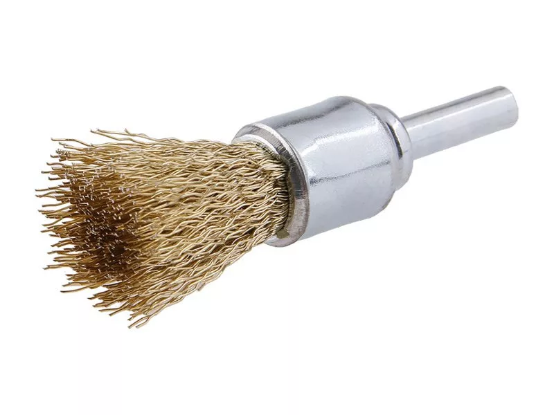 Rotierende Bürste - gewellt, FESTA Bürsten garantieren ausgezeichnete Materialien und Verarbeitung, Draht 0,3 mm - Messing Durchmesser 17 mm, Schaft 6 x 20 mm, verzinkter Bürstenkörper, Anzahl der Drähte: 150, Drahtlänge: 20 mm, max. zulässige Drehzahl: 4500 U/min, Anwendung: leichte Schleif- und Reinigungsarbeiten an schwer zugänglichen Stellen, Verpackung: Blisterverpackung mit Eurolochung.