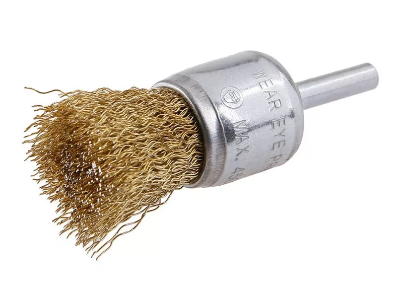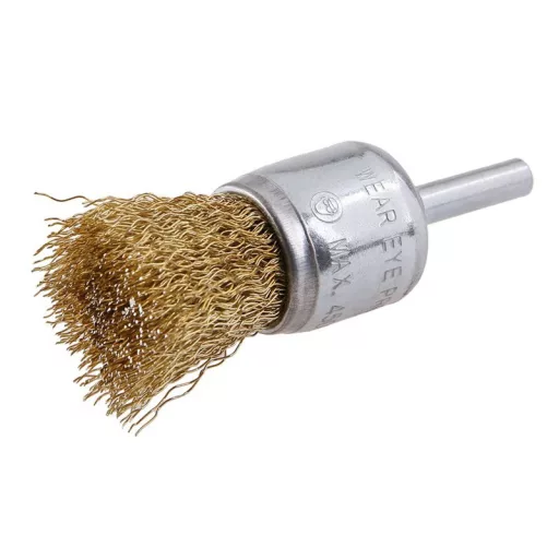 Rotierende Bürste - wellig, FESTA Bürsten garantieren exzellente Materialien und Verarbeitung, Draht 0,3 mm - Messing beschichtet, Durchmesser 25 mm, Schaft 6 x 20 mm, verzinkter Bürstenkörper, Anzahl der Drähte: 150, Drahtlänge: 20 mm, max. zulässige Drehzahl: 4500 U/min, Anwendung: leichte Schleifarbeiten und Reinigung an schwer zugänglichen Stellen, Verpackung: Blisterverpackung mit Eurolochung.