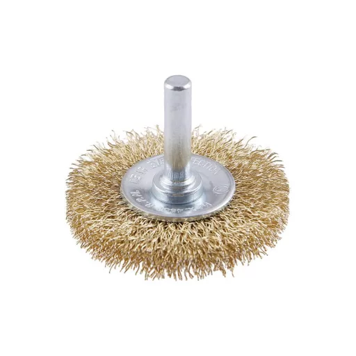 Forgókefe - kör alakú, kivitel: hullámos huzal 0,25 mm - sárgaréz, átmérő 50 mm, szár 6 x 27 mm, horganyzott kefetest, huzalok száma: 936, huzalhossz: 12,5 mm, megengedett fordulatszám: 4500 1 /. min, felhasználás: polírozáshoz, érdesítéshez, rozsda és sorja eltávolításához, csomagolás: euro lyukkal ellátott buborékfólia.