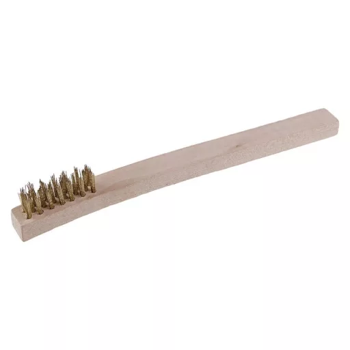 Acélkefe - kézi, acéldrót - sárgaréz bevonatú, fa test, kis kivitel, 3 soros, felhasználás: vasfémek, pl. acél, rozsdamentes acél, öntöttvas tisztítására, érdesítésre, régi bevonatok durva eltávolítására nehezen kivehető helyeket elérni.
