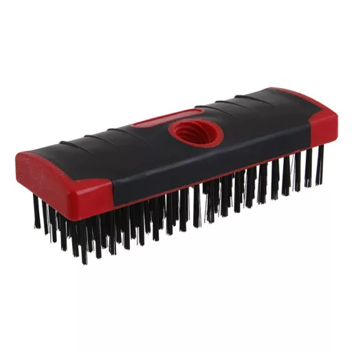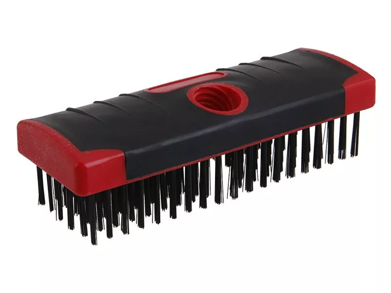 Acélkefe menettel, csavarozási lehetőség a nyéllel, acélhuzal - horganyzott, műanyag test gumi bevonattal, felhasználás: vasfémek, például acél tisztítására, érdesítésre és régi bevonatok durva eltávolítására. Mérete: 6 x 19 mm.