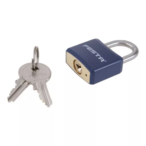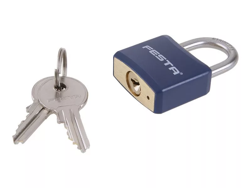 Vorhängeschloss mit Messingkörper und rostfreiem Stahlbügel. Der Schlosskörper aus Messing ist mit Kunststoff überzogen. 2 Schlüssel.