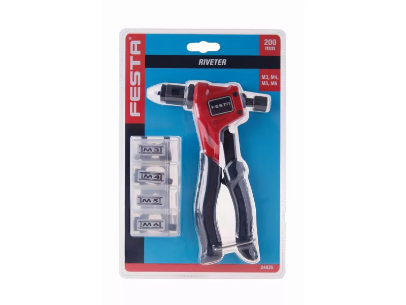 Professzionális szegecselő fogó szegecsanyákhoz / anyaszegecsekhez. Hossza 200 mm. M3, M4, M5, M6 anyákhoz, anyagokból: alumínium, sárgaréz, acél és rozsdamentes acél. 4 db szegecsadapter jár hozzá. A fogó Cr-Mo anyagból, szénacélból és PVC-ből készül. Egy szegecsanyával szegecselt csatlakozásban sértetlen menet jön létre, amelyhez könnyen csatlakoztathat más alkatrészeket.