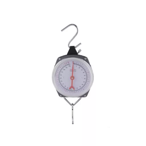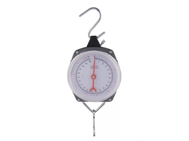 Egy nagy pénzverő, tiszta skálával. A mérleg nullázása egy forgó elemmel a skála felső részén. A csomag tartalmaz egy felső és egy alsó horgot. Mérlegek kg-ban és fontban.