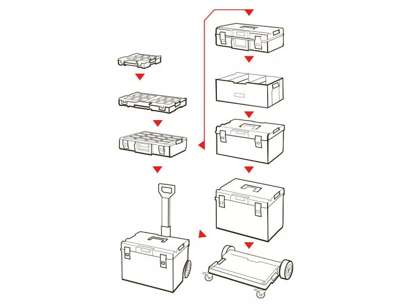Der Organizer L ist mit 10 Behältern für kleinere Zubehörteile ausgestattet und schützt deren Inhalt mit flexibler Dichtung vor dem Eindringen von Wasser und Staub.