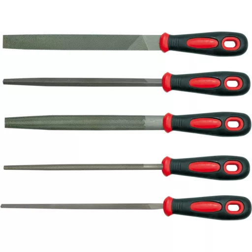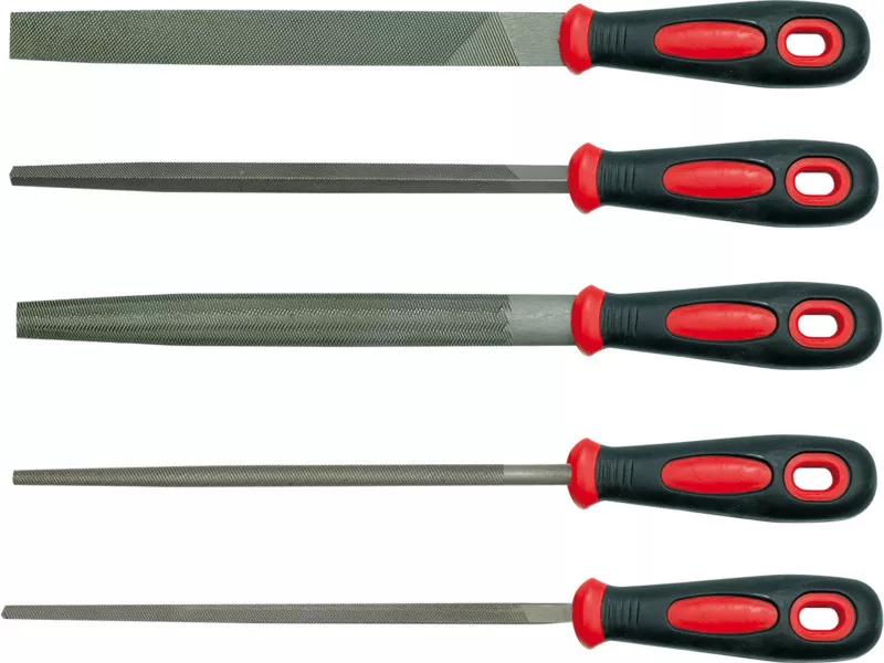 The kit includes fucker with flat and semi -circular profiles as well as a round, triangular and square file. Files twice cut with durable plastic handles.
