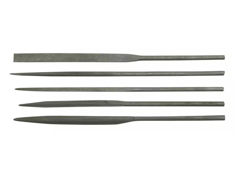 The set includes five files for precise works, e.g. making keys. The basic profiles are flat, semi -circular, round, triangular, and knife. Filots with tips without plastic frames. For precise metal processing, some plastics and other materials