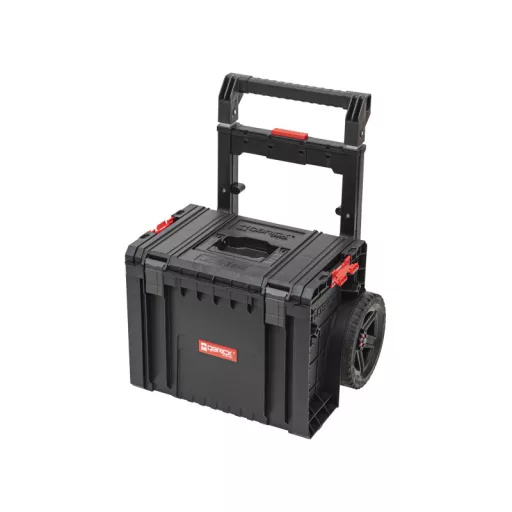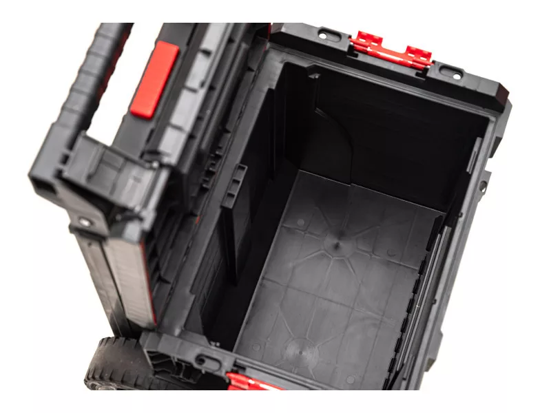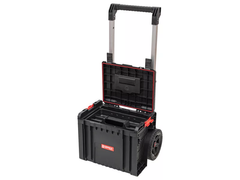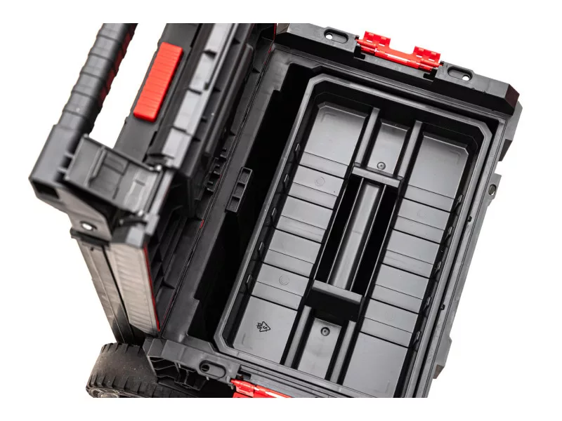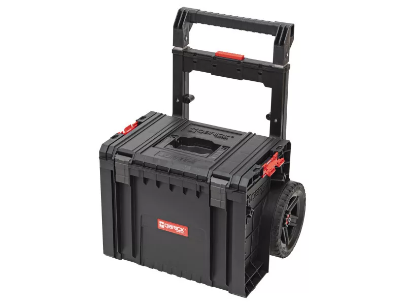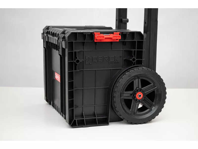 Der Qbrick System PRO Cart ist ein rollender, mobiler Werkzeugkasten mit einem teleskopischen Aluminiumgriff, der auch die Basis der neuen, kompaktesten PRO-Serie in mehreren Modulen ist. Der Kasten hat große, gummierte Räder, die auf einer Metallachse montiert sind.