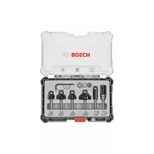 Das Set ist in drei Varianten erhältlich: Mit 6 mm, 8 mm oder ¼ Zoll Durchmesser Schaft, so dass es mit allen handgeführten Oberfräsen auf dem Markt verwendet werden kann
