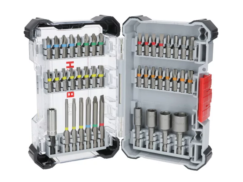 Das 43-teilige Extra Hard Set enthält alle normalen Schrauberbits und Steckschlüssel, die für Schraubarbeiten benötigt werden. Die Schrauberbits sind aus wärmebehandeltem S2, modifiziertem Stahl gefertigt, um Härte und Verschleißfestigkeit zu gewährleisten. Die Teile sind farbcodiert, so dass das gewünschte Zubehör leicht ausgewählt werden kann. Das Set ist in einem robusten Pick and Click Etui untergebracht, mit dem Sie Ihre eigene Werkzeugkiste erstellen können und die Schrauberbits gut organisiert und geschützt aufbewahren können.