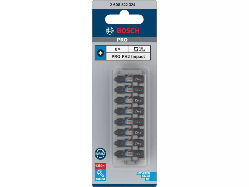Der PRO Impact PH Schrauberbit ist eine ausgezeichnete Wahl für Mechaniker, die nach einem leistungsstarken, hochbelastbaren Schlagschrauberbit suchen. Die Bits werden aus wärmebehandeltem, modifiziertem Stahl für herausragende Festigkeit und Widerstandsfähigkeit gegen hohes Drehmoment hergestellt. Ihre Torsionszone absorbiert die durch das Drehmoment an der Bit-Spitze erzeugte Spannung, um sicherzustellen, dass sie nicht brechen. Sie sind mit Ringen für die Farbcodierung versehen, die den Kopftyp anzeigen, sowie mit Lasemarkierungen, die bei der Auswahl der benötigten Größe helfen.