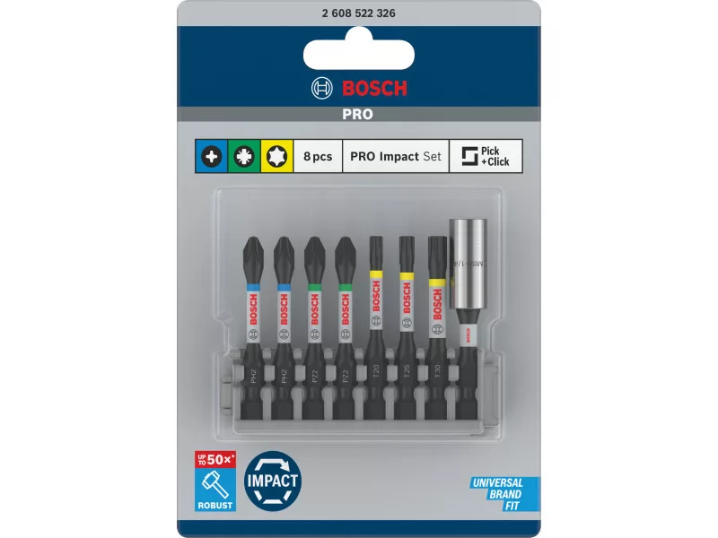 Das PRO Impact Set ist eine ausgezeichnete Wahl für Mechaniker, die nach leistungsstarken, hochbelastbaren Schlagschrauber-Bits suchen. Die Bits sind aus wärmebehandeltem, modifiziertem Stahl gefertigt, um herausragende Festigkeit und Widerstandsfähigkeit gegen hohes Drehmoment zu gewährleisten. Ihre Torsionszone absorbiert die Spannung, die durch das Drehmoment an der Spitze des Bits erzeugt wird, um sicherzustellen, dass sie nicht brechen. Jedes Bit verfügt über einen Ring zur Farbkodierung, der den Kopftyp anzeigt, sowie eine Lasermarkierung, die bei der Auswahl der benötigten Größe hilft.