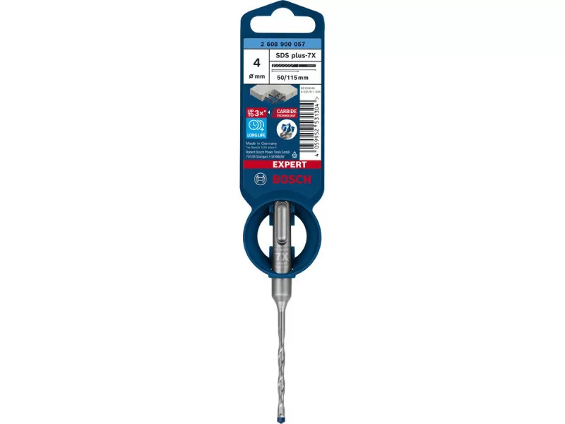 Der EXPERT SDS plus-7X hat eine solide Hartmetallspitze mit einem verbesserten 4-Klingen-Design, das aus dem härtesten Einzelstück Metall hergestellt ist: Es verfängt sich nicht und wird beim Hämmern nicht weich