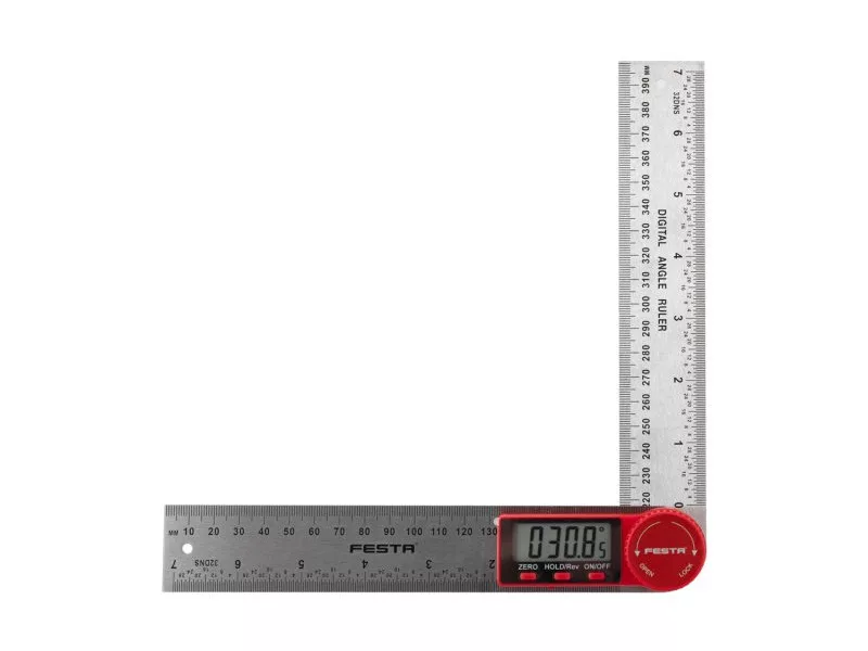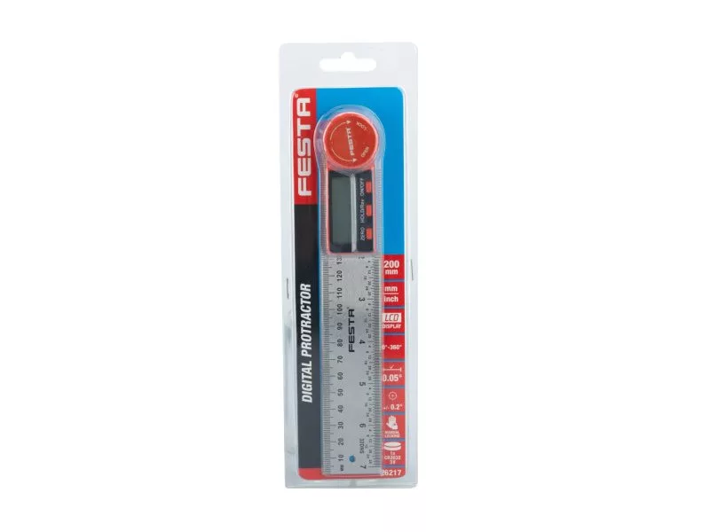 Digitális szögmérő belső és külső szögek mérésére. Reteszelő csavarral felszerelve egy bizonyos szög megtartásához. Mérési tartomány ± 360 °. Pontosság ± 0,3 °. Üzemi hőmérséklet 0-50°C. Automatikus kikapcsolás. Nulla beállítás bármilyen helyzetben. 1 mm-es és 1/32 hüvelykes vonalzós mérlegek. Vonalzó keresztmetszete 35 x 2,5 mm. Két rögzítési lyuk. Rögzítő csavarok. Tápellátás 1 db CR2032 3V típusú elem.