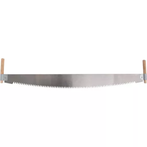 Crosscutting saw made of resilient sheet metal with a length of 1000 mm and two wooden handles.
