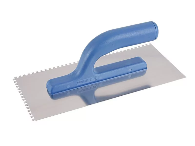 Rozsdamentes fogazott simító FESTA 280x130 mm, e4 fog, műanyag nyéllel, lemezvastagság 0,8 mm. Elsősorban csempék és burkolatok alá ragasztók felhordására, valamint esztrichek, stukkó, vakolatok, tömítőanyagok és egyéb építőanyagok felhordására használják. A rozsdamentes fogazott simító lehetővé teszi a ragasztó vagy építőanyag nyújtását csíkokban és a simító fogának megfelelő magasságban.