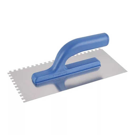 Rozsdamentes fogazott simító FESTA 280x130 mm, e6 fogú, műanyag nyéllel, lemezvastagság 0,8 mm. Elsősorban csempék és burkolatok alá ragasztók felhordására, valamint esztrichek, stukkó, vakolatok, tömítőanyagok és egyéb építőanyagok felhordására használják. A rozsdamentes fogazott simító lehetővé teszi a ragasztó vagy építőanyag nyújtását csíkokban és a simító fogának megfelelő magasságban.