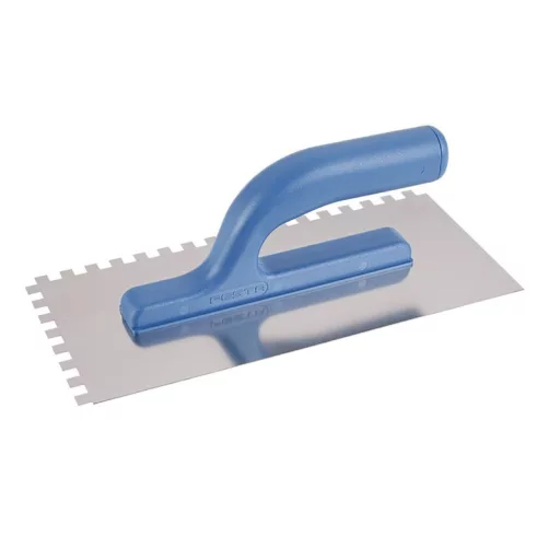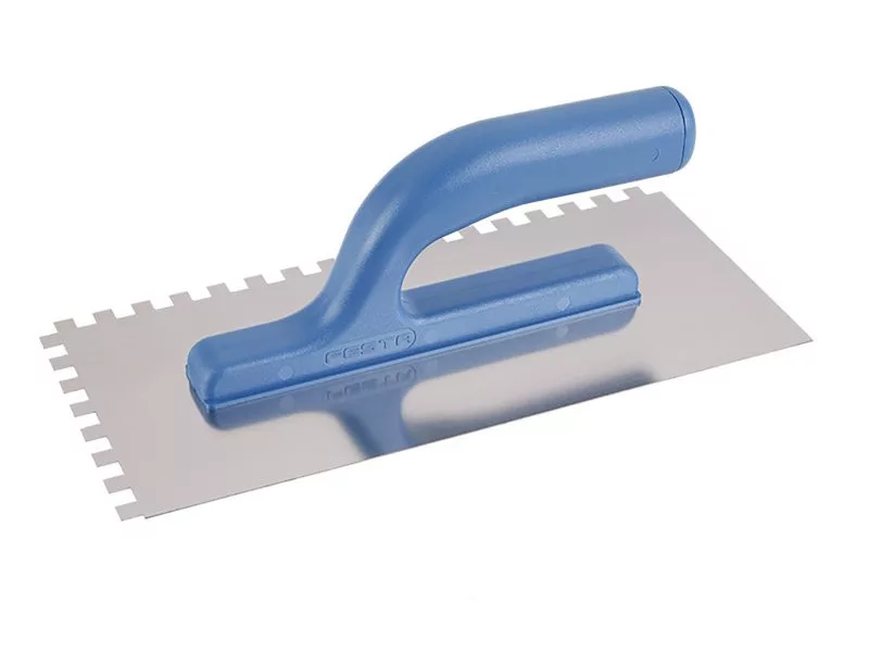 Rozsdamentes fogazott simító FESTA 280x130 mm, e8 fogú, műanyag nyéllel, lemezvastagság 0,8 mm. Elsősorban csempék és burkolatok alá ragasztók felhordására, valamint esztrichek, stukkó, vakolatok, tömítőanyagok és egyéb építőanyagok felhordására használják. A rozsdamentes fogazott simító lehetővé teszi a ragasztó vagy építőanyag nyújtását csíkokban és a simító fogának megfelelő magasságban.