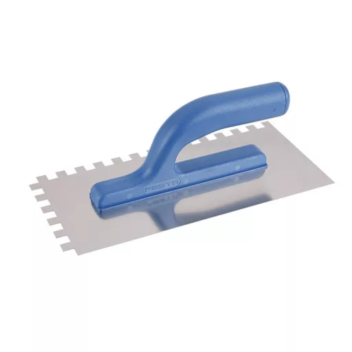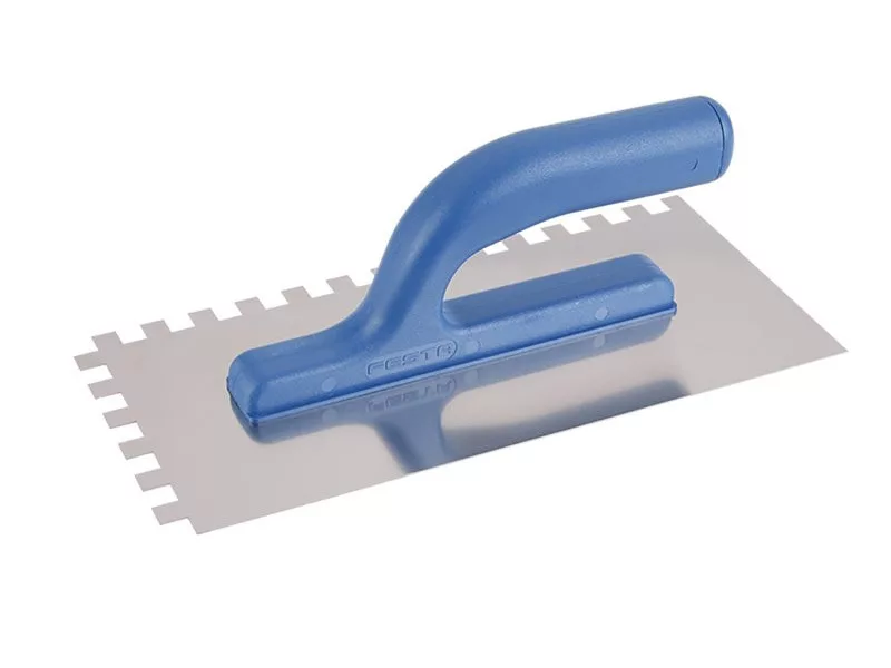 Rozsdamentes fogazott simító FESTA 280x130 mm, e10 fog, műanyag nyéllel, lemezvastagság 0,8 mm. Elsősorban csempék és burkolatok alá ragasztók felhordására, valamint esztrichek, stukkó, vakolatok, tömítőanyagok és egyéb építőanyagok felhordására használják. A rozsdamentes fogazott simító lehetővé teszi a ragasztó vagy építőanyag nyújtását csíkokban és a simító fogának megfelelő magasságban.