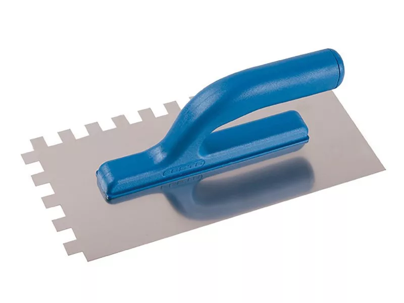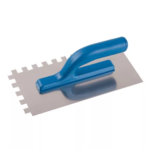 Rozsdamentes fogazott simító FESTA 280x130 mm, e12 fog, műanyag nyéllel, lemezvastagság 0,8 mm. Elsősorban csempék és burkolatok alá ragasztók felhordására, valamint esztrichek, stukkó, vakolatok, tömítőanyagok és egyéb építőanyagok felhordására használják. A rozsdamentes fogazott simító lehetővé teszi a ragasztó vagy építőanyag nyújtását csíkokban és a simító fogának megfelelő magasságban.