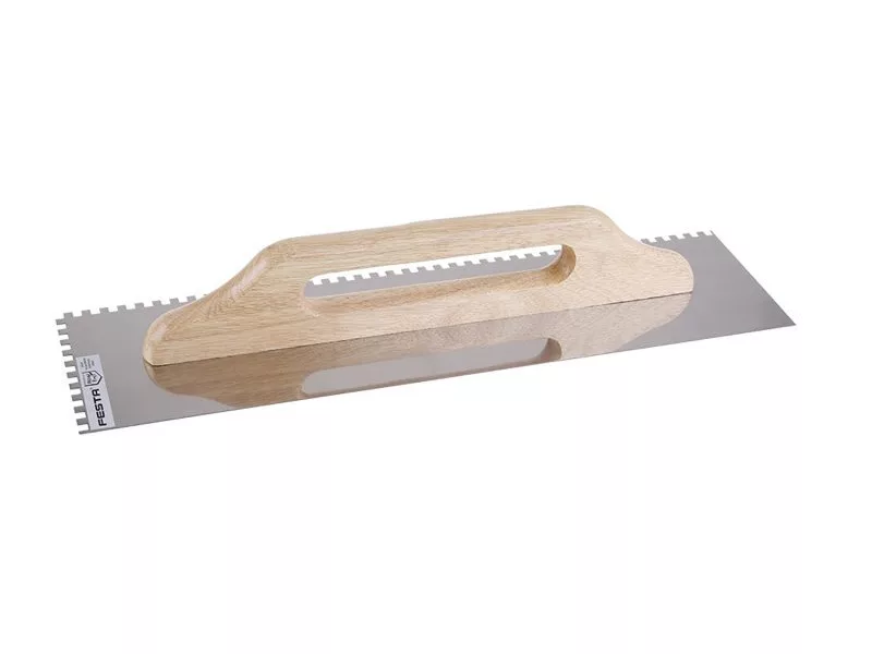 Rostfreier gezahnter Glätter FESTA 500x130 mm, e6 Zahn, mit Holzgriff, Blechstärke 0,7 mm. Hauptsächlich verwendet für das Auftragen von Klebstoffen unter Fliesen und Verkleidungen, sowie Estrichen, Stuck, Putz, Dichtstoffen und anderen Baumaterialien. Der rostfreie gezahnte Glätter ermöglicht das Auftragen von Klebstoff oder Baumaterial in Streifen und in der entsprechenden Höhe des Glätterzahns.
