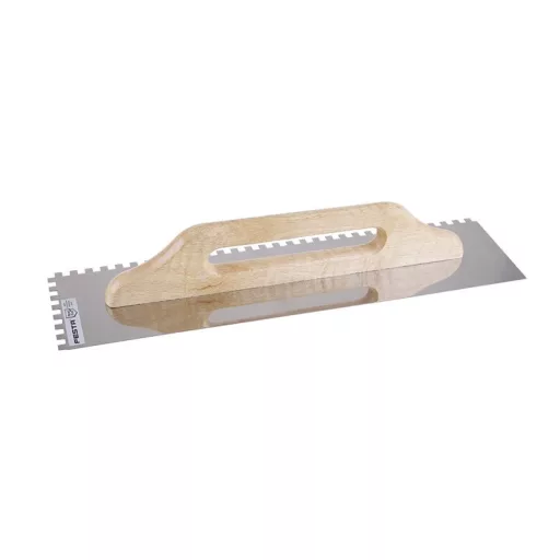 Edelstahl-Zahnkelle FESTA 500x130 mm, e8 Zahnung, mit Holzgriff, Plattenstärke 0,7 mm. Hauptsächlich für das Aufbringen von Klebstoffen unter Fliesen und Belägen sowie für Estriche, Stuck, Putz, Dichtungsmaterialien und andere Baustoffe verwendet. Die Edelstahl-Zahnkelle ermöglicht das Streifenziehen von Klebstoff oder Baustoff und die angemessene Höhe der Kellenzähne.