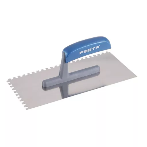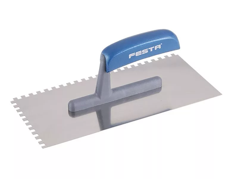 Rozsdamentes fogazott simító FESTA 280x130 mm, e6 fog, fa lakkozott nyéllel, lapvastagság 0,8 mm. Elsősorban csempék és burkolatok alá ragasztók felhordására, valamint esztrichek, stukkó, vakolatok, tömítőanyagok és egyéb építőanyagok felhordására használják. A rozsdamentes fogazott simító lehetővé teszi a ragasztó vagy építőanyag nyújtását csíkokban és a simító fogának megfelelő magasságban.