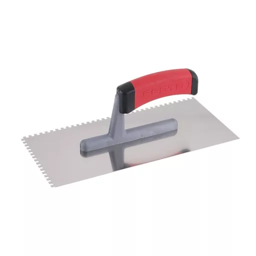 Edelstahl-Zahnspachtel FESTA 280x130 mm, e4 Zahnung, mit Gummigriff, Blechstärke 0,8 mm. Hauptsächlich für das Auftragen von Klebstoffen unter Fliesen und Verkleidungen, sowie Estrichen, Stuck, Putzen, Dichtstoffen und anderen Baustoffen verwendet. Der Edelstahl-Zahnspachtel ermöglicht das Auftragen des Klebstoffs oder Baustoffs in Streifen und in der passenden Höhe der Spachtelzähne.