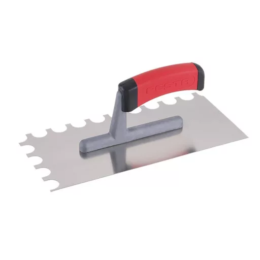 Rozsdamentes fogazott simító FESTA 280x130 mm, O16 fogú, gumi nyéllel, lemezvastagság 0,8 mm. A teherhordó területeken a burkolat alatti ragasztó nyújtására szolgál.