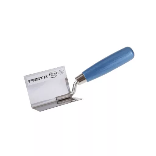Eckglätter Löffel FESTA 80 x 60 x 60 mm, mit Holzgriff. Der Ecklöffel ist aus hochwertigem Edelstahl gefertigt, hat eine Dicke von 1,0 mm und einen lackierten Holzgriff. Der Glätter dient zum Einstellen und Reinigen von Innen- und Außenecken.