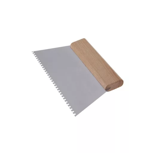 Stahlglätter mit 250 mm Zahnung e4 und Holzgriff. Der Glätter ist für Maler-, Maurer- und Bodenverlegearbeiten geeignet. Er dient zum Auftragen von selbstnivellierenden Mischungen, Klebstoffen, Mörtel usw.