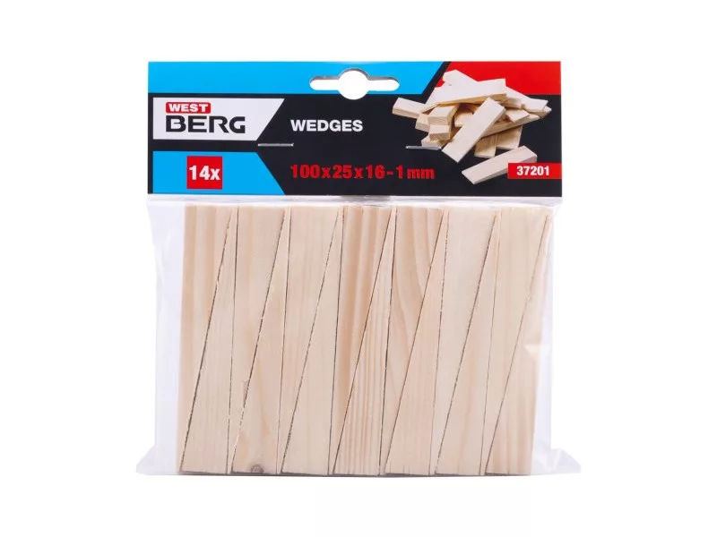 Fa ékek (luc), méret: 100 x 25 x 1-16 mm, mennyiség: 14 db, felhasználás: nyílászárók, ajtókeretek és fémszerkezetek beépítéséhez, csomagolás: eurólyukkal ellátott buborékfólia.