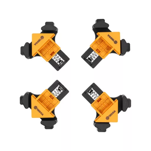 The set of spring corner clamps is a practical addition to any woodworking and assembly workshop, designed for quickly joining elements at a 90° angle. The spring-loaded design allows for efficient stabilization of components during gluing, screwing, or preliminary assembly, without the need for complex clamping systems. They are effective when working with wood, wood-based materials, and lightweight plastics, particularly for precisely aligning corners when assembling frames, boxes, furniture, and other constructions that require maintaining a right angle.