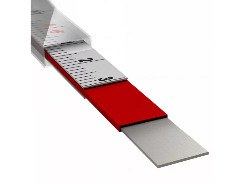 • Messskala auf beiden Seiten. Die metrische Skala befindet sich auf der Oberseite des Bandes, die angloamerikanische Skala auf der Unterseite.