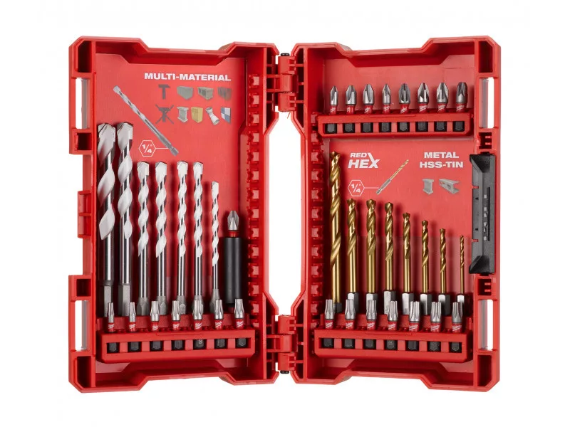 • 23 x SHOCKWAVE™ Schrauberbits 25 mm lang: PH1 / 3 x PH2, PZ1 / 3 x PZ2 / PZ3, 2 x TX10 / 2 x TX15 / 4 x TX20 / 3 x TX25 / 3 x TX30