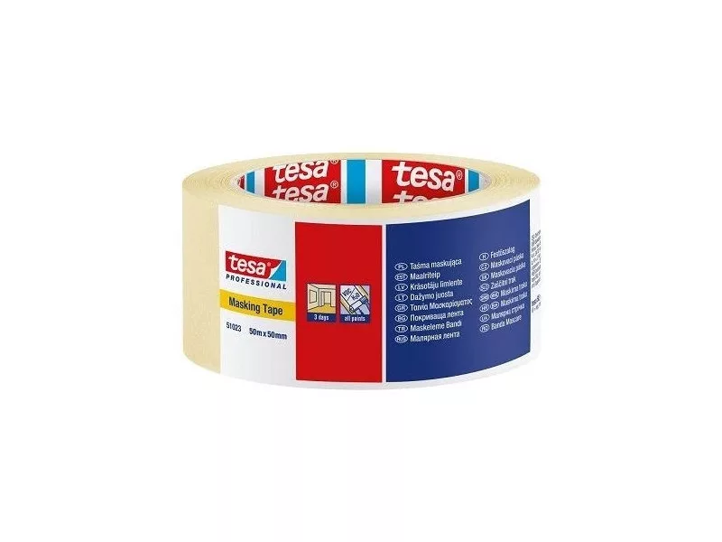 A tesa 51023 általános célú festőszalag enyhén kreppelt textúrájú, gyorsan és könnyen eltávolítható, 3 napig nyom nélkül visszaszedhető és alkalmas általános célú alkalmazásokhoz: tartás, tömítés, rögzítés, kis igénybevételű csomagolás stb.