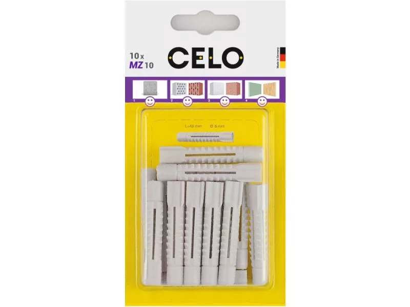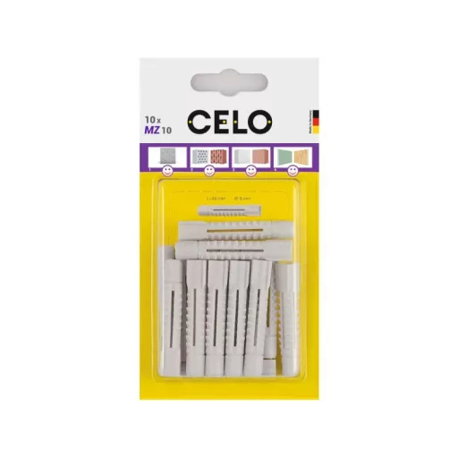 Der universelle Dübel CELO MZ hat seine Exzellenz millionenfach bewiesen und kann in praktisch allen Baumaterialien verwendet werden. Die 4-Wege-Expansion des Dübels in dichten Materialien und seine Knotenbildungseffekte in hohlen Baumaterialien und Gipskarton sorgen immer für eine angemessene Befestigung mit hoher Belastbarkeit. Er ist kompatibel mit verschiedenen Arten und Größen von Schrauben. Enthält hochwertiges Polyethylen, das die dauerhafte Flexibilität des universellen MZ Dübels garantiert.