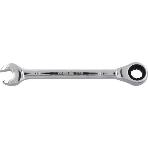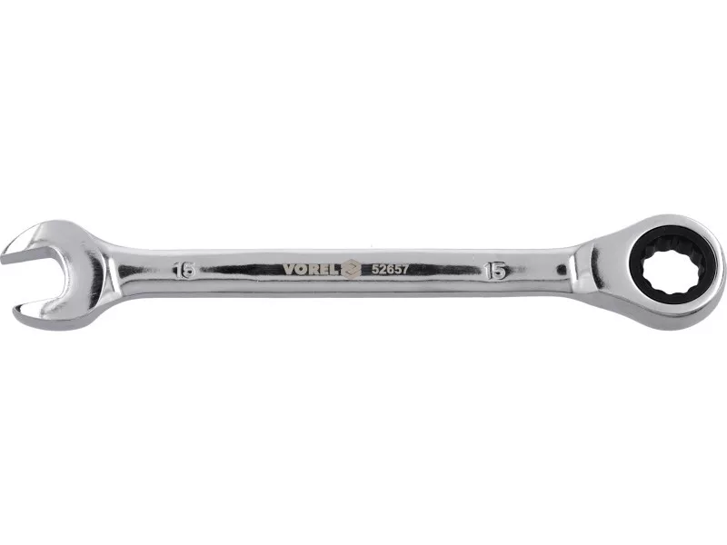 Flat-pocket key with a 15 mm ratio of Vorel 52657. Made of CRV chrome-vanadium steel. The ratchet has 72 teeth. The surface finished with chrome.