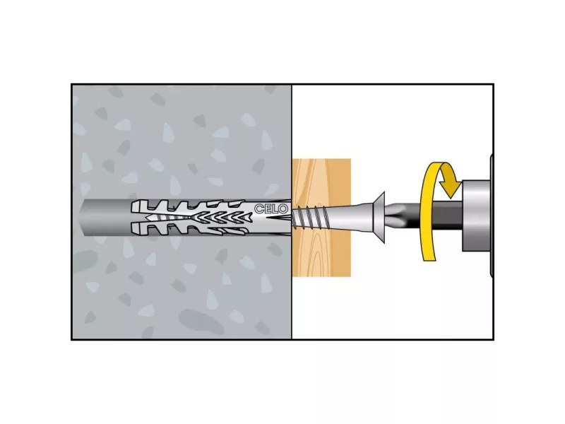 Der CELO F Universaldübel hat dank seiner hohen Expansionsfähigkeit hohe Auszugswerte. Er ist in einer breiten Größenpalette von 4-20 mm Durchmesser erhältlich. Der F Universaldübel ist die ideale Wahl für massive Baustoffe, aber auch in Hohlziegel- und Porenbetonstrukturen hat er gute Belastungswerte. Durch die gute Schraubenführung verrutscht die Schraube beim Eindrehen nicht.