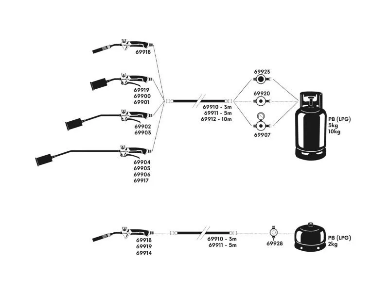• csatlakozás a szabályozókon keresztül 69923, 69920, 699075, 10, 33 kg-os palackokhoz