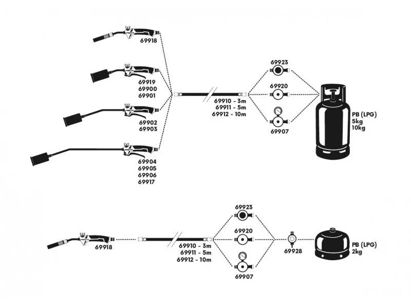 • Anschluss über Regler 69923, 69920, 69907 für Flaschen 5, 10, 33 kg