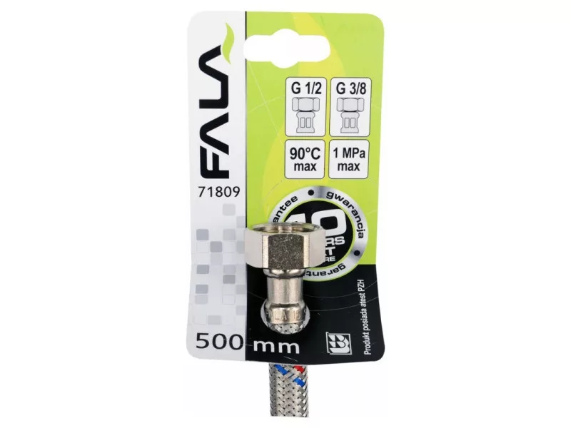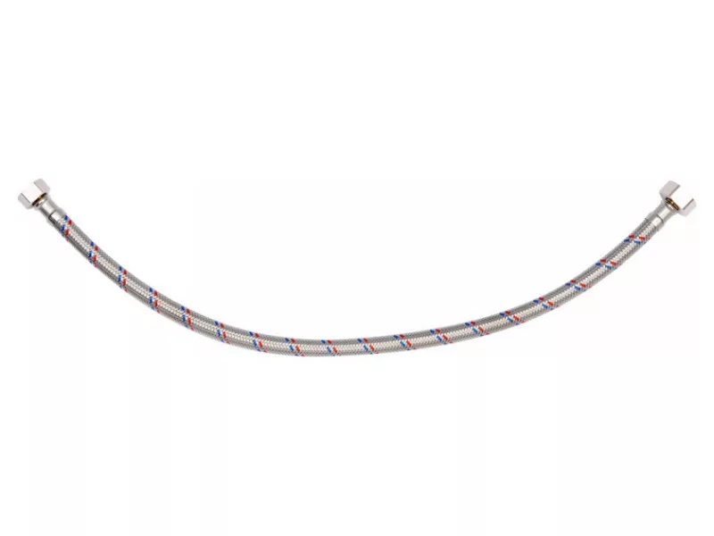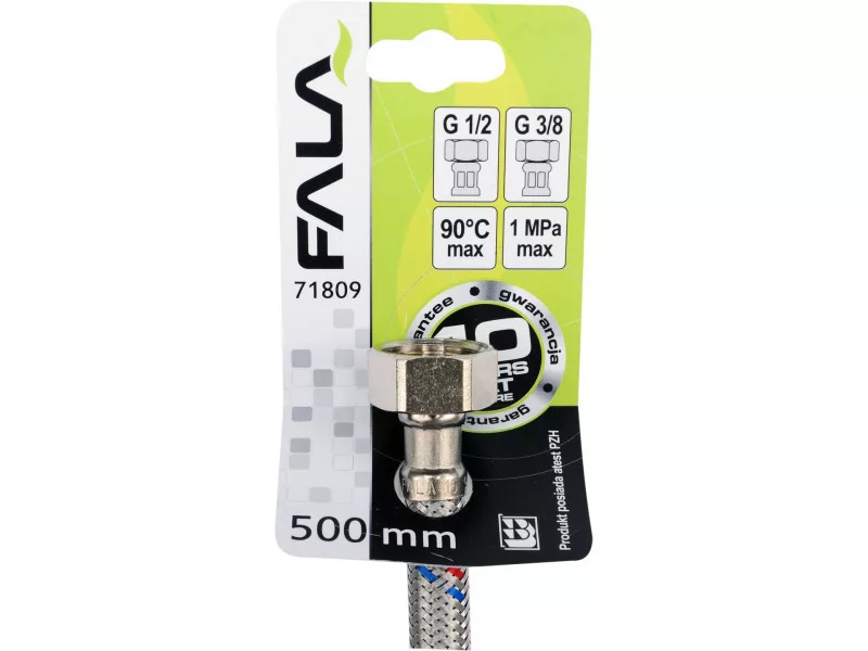 Flexible stainless steel braided connection hose. It is designed for hot and cold water. It has a PZH certificate for contact with drinking water. Length 500mm. Max pressure 1MPa. Max temp 90st C. Average flow rate 32L/min. Inner diameter 8mm and outer diameter 12mm. Connection thread: female 1/2" x female 3/8". Rubber hose made of EPDM rubber, nickel-plated brass connections, EPDM rubber gasket. It is designed from the connection of toilet cisterns or valves.