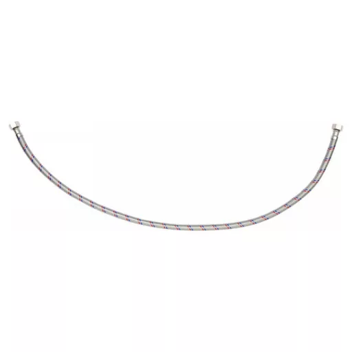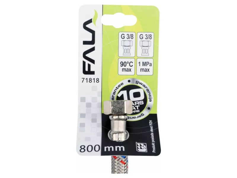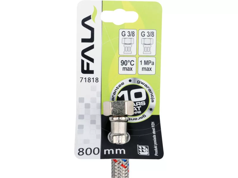 Flexible stainless steel braided connection hose. It is designed for hot and cold water. It has a PZH certificate for contact with drinking water. Length 800mm. Max pressure 1MPa. Max temp 90st C. Average flow rate 32L/min. Inner diameter 8mm, and outer diameter 12mm. Connection thread: female 3/8" x female 3/8". Rubber hose made of EPDM rubber, nickel-plated brass connections, EPDM rubber gasket. It is designed from the connection of toilet cisterns or valves.