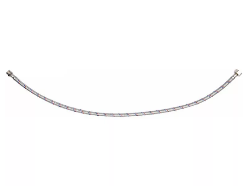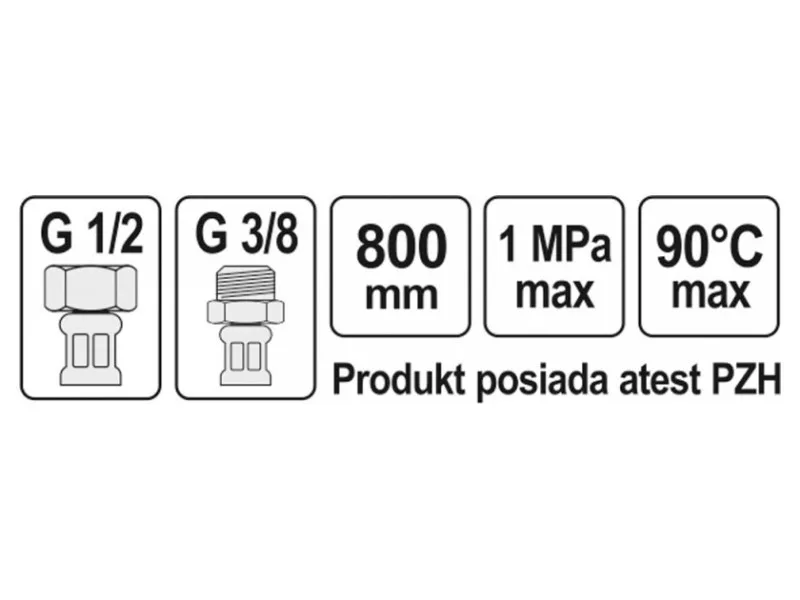 Flexible stainless steel braided connection hose. It is designed for hot and cold water. It has a PZH certificate for contact with drinking water. Length 800mm. Max pressure 1MPa. Max temp 90st C. Average flow rate 32L/min. Inner diameter 8mm, and outer diameter 12mm. Connection thread: female 1/2" x male 3/8". Rubber hose made of EPDM rubber, nickel-plated brass connections, EPDM rubber gasket. It is designed from connecting toilet cisterns or valves.