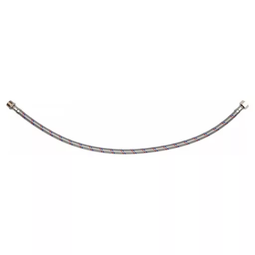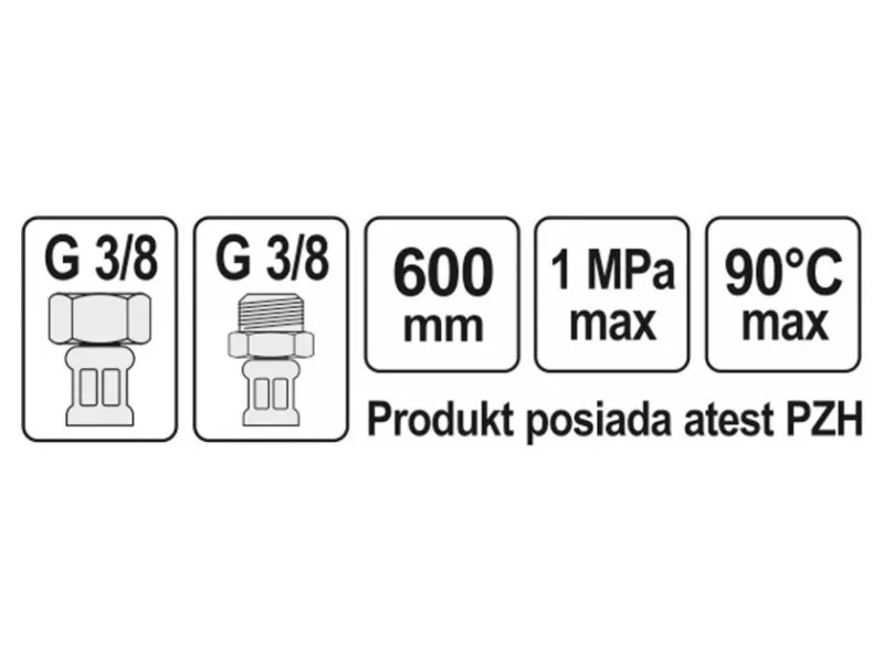 Flexible stainless steel braided connection hose. It is designed for hot and cold water. It has a PZH certificate for contact with drinking water. Length 600mm. Max pressure 1MPa. Max temp 90st C. Average flow rate 32L/min. Inner diameter 8mm, and outer diameter 12mm. Connection thread: female 3/8" x male 3/8". Rubber hose made of EPDM rubber, nickel-plated brass connections, EPDM rubber gasket. It is designed from the connection of toilet cisterns or valves.